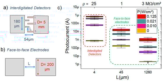In order to better understand the responsivities measured in Figure 3, we have compared the photogenerated currents for different devices. The interdigitated combs with 4 µm distance previously studied (Figure 4a) were compared to face-to-face electrode pads with a 200 × 200 µm2 surface and distances of L = 45 and 1260 µm (Figure 4b). Figure 4c presents the averaged current (for a statistic over 10 measurements) as a function of the excitation light intensity for the three different designs, including interdigitate electrodes at 1 V polarization. Results are presented on a log scale to capture their full dynamics. Furthermore, layer resistivity was also extracted from such data using the following equation: