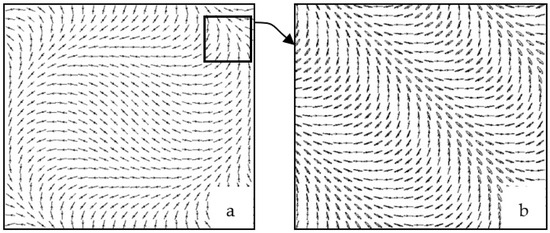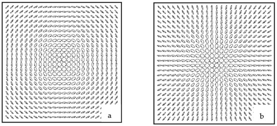 Consider in more detail the mechanism of generation of a double topological charge by means of a uniaxial crystal. A typical map of the polarization distribution of a beam that has passed through an anisotropic medium and a polarization filter (a quarter-wave plate and a polarizer) is shown in Figure 11a. We see that right-hand circular polarization is located on the beam axis. This exceptional state of polarization surrounds a family of ellipses. A characteristic property of this family is the typical ordering of orientation directions of the major semiaxis of the ellipse. If we draw integral curves—lines tangent at each point to the semi-major axis—we will get a characteristic pattern of spirals (see Figure 11b). These integral curves are analogous to lines of force for a linearly polarized (at each point) electric or magnetic field. In this case, they represent the lines of force of the inhomogeneously polarized beam. Such a pattern of integral curves near the singular point is similar to the distribution of lines of equal curvature of the wave front near the wave caustics [26]. They are called umbilic points. In the future, we will keep this analogy, calling these patterns surrounding polarization singularities polarization umbilics [11,19,25].