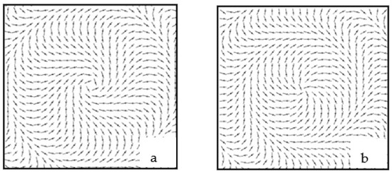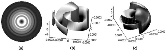 Comparing Expressions (34) and (35), the y-component in Expression (36) describes the same helical edge dislocation as in Expression (34). Generally speaking, the images presented in Figure 8 have been known for quite a long time in crystallography as Airy spirals, and are used to distinguish right-handed and left-handed crystals. However, our path shows a way to create spiral singular beams. Thus, from Expression (35), it follows that the radius of the first ring dislocation can be found from the following condition: . Provided that the beam waist at the entrance face of the crystal is equal to , the contribution of the energy flux to the ring dislocation is negligibly small. The configuration of the spiral beam field is shown in Figure 8.