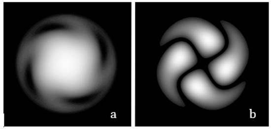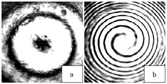 The polarizer cuts out the —component from the spiral vortex field. Thus, the intensity and interference distribution takes the form shown in Figure 10.