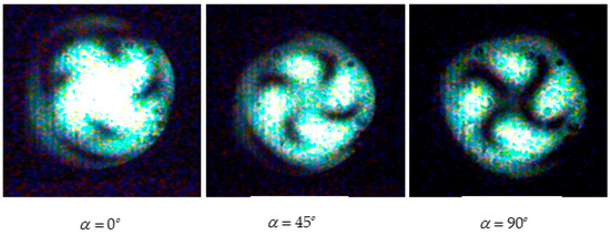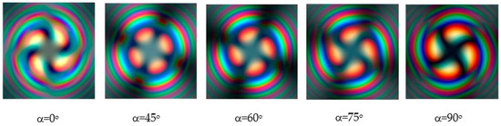 Figure 14 shows typical images of a singular beam. When the angle is , a pure spiral vortex beam dislocation is embedded in the beam. It is important to note that the dislocations are not washed out in polychromatic light, but are seen as clear spiral lines with four branches. The method of generation of polychromatic singular spiral vortex beams described in this paper can be applied by other researchers to analyze the properties of spin and orbital angular momentum [5,9,22].