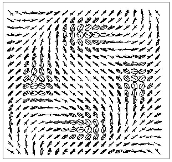 It is necessary to point out some characteristic features of the picture obtained as a result of the action of the perturbation (see Figure 12). First of all, unstable singularities disappear. The unstable C-point in the center of the picture splits into two single C-points displaced along the beam . In the structure of the Figure 12, there are two more simple C-points located on the beam . These two singularities arose as a result of the splitting of the unstable C-line into four symmetrically located C-points: two shifted along the rays to the beam axis.