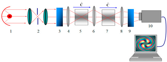 The scheme of the experimental setup is shown in Figure 13. The key element of the installation is a white light source, which is a halogen lamp equipped with a spherical mirror. The angular divergence of the beam after passing through the spatial lens filter becomes less than . The beam then passes through a polarizer to become linearly polarized.