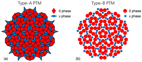 Two kinds of PTMs when the iteration number . (a) Type-A PTM with rhombic tiles. (b) Type-B PTM with circular tiles. Phases 0 and are modulated in different tiles in the PTMs.