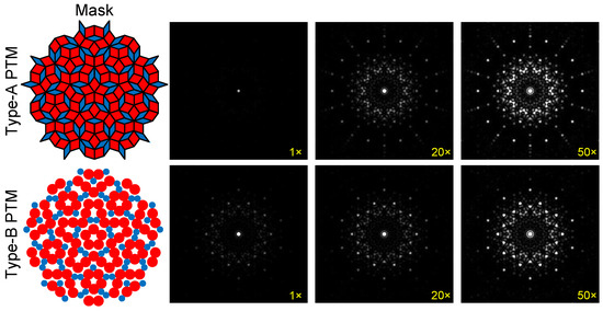 Figure 2 shows the diffraction patterns of the x-polarized SOF passing through type-A and type-B PTMs with . When type-A PTM is applied, the diffraction pattern exhibits one strong focal spot at the center, as shown in the first row of Figure 2. In order to show more details of the diffraction patterns, we magnify the intensity of the diffraction patterns to different degrees. When the intensity is magnified 20 and 50 times, more diffraction spots appear around the central spot, but the diffraction patterns always exhibit a tenfold mirror symmetry. When type-B PTM is applied, the diffraction pattern also exhibits one strong focal spot at the center and a tenfold mirror symmetry, as shown in the second row of Figure 2. Compared with the case of type-A PTM, the size of the diffraction pattern of type-B PTM is smaller. This is easy to understand as the shape of the tiles in type-B PTM is circular, and their diffraction effect is weaker than that of the rhombic tiles in type-A PTM. Meanwhile, the intensity of the secondary diffraction spots is stronger for the case of type-B PTM, as shown in the second and third columns of Figure 2. The number of diffraction spots is smaller for the case of type-B PTM, which can be seen from the fourth column of Figure 2.