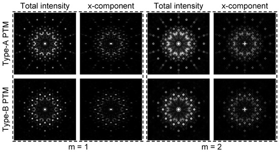 Figure 3 shows the diffraction patterns of the VOFs when and 2 passing through type-A and type-B PTMs, respectively. Obviously, the diffraction spots in the intensity patterns are also with space-variant polarizations, and the topological charge of each focal ring is the same with the incident VOF. When we observe the x component of the diffraction field in the second column of Figure 3, any diffraction ring exhibits two petals, which is two times the topological charge m of the incident VOF. Meanwhile, the diffraction spot exhibits four petals when in the fourth column of Figure 3, and the number of the petals is also two times that of m. All the diffraction patterns exhibit a tenfold mirror symmetry, and the diffraction patterns when are extremely similar to the patterns when , except that the size of the focal ring when is larger. We should also point out that we only showed the total intensity and the intensity of the x component in Figure 3, and the intensity of the y component can be derived by the total intensity and the intensity of the x component.
