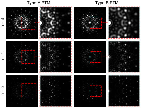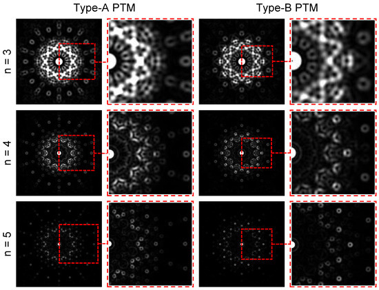 For the PTMs we propose, there is an important modulation degree of freedom to control and manipulate the diffraction fields. This parameter is the iteration number n of the PTM, which holds the “weeding” function in modulating the diffraction field. The “weeding” function is an important property when modulating and applying the diffraction field or the focal field [39,43]. When the field is weeded, the energies of the diffraction field or the focal field become more concentrated, which can be applied in a variety of areas, including focal engineering, optical trapping, optical machining, and information transmission. Figure 4 shows the diffraction patterns of the x-polarized SOF passing through type-A and type-B PTMs when , 4, and 5 in three rows, respectively. From the first and third columns, we can see that the diffraction patterns always exhibit a tenfold mirror symmetry for all the cases. When n increases, the sizes of the intensity patterns also increase, which is understandable as the complexity of the phase mask increases along with the increasing n. Meanwhile, the sizes of the diffraction patterns are always smaller for the case of type-B PTM. From the enlarged figures in the second and fourth columns, it can be found that the diffraction spots become cleaner with the increasing values of n. This proves the “weeding” function of the iteration number n of type-A and type-B PTMs for the input SOF.