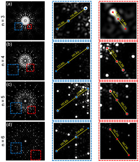 In this research, we surprisingly find that the Golden ratio also appears in the diffraction patterns of the PTMs. Figure 6 shows the diffraction patterns of the x-polarized SOFs passing through type-A PTMs when , 4, 5, and 6 in four rows. The first column shows the diffraction patterns, and we can see that the diffraction patterns exhibit a tenfold mirror symmetry. The second and third columns offer the enlarged patterns of the blue and red rectangles shown in the first column, and the wavelength is used as the normalization of distance. In the enlarged patterns, we choose three peak spots in each pattern, and show the distance between the adjacent diffracting spots. The angles between the connecting lines of these spots and the negative y-axis are and , respectively. We surprisingly find that the distance ratio of the diffraction peak spots in the second and third columns is close to the Golden ratio. This phenomenon can be regarded as the label of the Golden ratio appearing in the diffraction patterns. The labels of the Golden ratio appear 10 times in the diffraction patterns for both cases of PTMs due to the tenfold symmetry of the diffraction patterns. In addition, the case of the diffracted VOF passing through the PTM is similar to the results in Figure 6, except that the diffraction spots become the diffraction rings with space-variant polarization distributions. This means that the label of the Golden ratio also appears in the diffraction pattern of the incident VOF.
