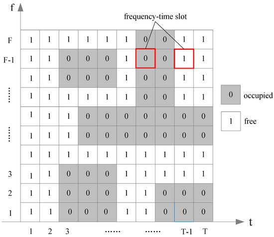 Here, represents the state of the frequency–time slot represented by the frequency slot and the time slot on link l. When , it indicates that the frequency–time slot is occupied, while when it indicates that the frequency–time slot is free. Consequently, the state matrix of the link resource model can be obtained as follows:
