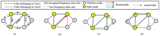 We provide an example to illustrate this. Figure 2 shows a network topology diagram with six nodes and nine links. The white nodes represent non-filtering nodes and the yellow nodes represent filtering nodes. The long dashed lines represent fiber tree 1 (Tree1), and the short dashed lines represent fiber tree 2 (Tree2). Each link has a total resource capacity of 10. Figure 2a displays the resource occupancy in the network. Assuming that request is from node 6 to node 3 (6→3), the K-shortest path algorithm finds three routing paths for it. According to the path distance, they are Path1 (6→3), Path2 (6→5→3), and Path3 (6→1→2→3). Due to the broadcast nature of non-filtering nodes, the signal propagates throughout the fiber tree. As shown in Figure 2c, Path2 has two wasted links, namely, link (5,4) and link (4,3). Using Equations (6) and (7), we can calculate the link resource-aware factor for Path1 as and the path resource-aware factor as . The link resource-aware factor for Path2 is and the path resource-aware factor is . The link resource-aware factor for Path3 is and the path resource-aware factor is . Sorting the paths in ascending order based on the path resource-aware factor E, the correct order is Path1 (6→1→2→3), Path2 (6→5→3), Path3 (6→3).
