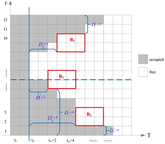 An example showing the investigated factors. (In the graph, , , and represent frequency–time blocks, is the minimum distance between the frequency–time block and the spectrum boundary, and is the distance between the frequency–time block and the earliest start time).