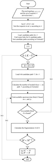 The first line of the algorithm is used for initialization. The second line involves sorting the requests using a request sorting strategy during the request scheduling phase. Lines 3–20 find the propagation path and frequency–time block for each request. Lines 4–7 sort the K shortest paths based on the path-aware factor E. Lines 8–19 involve a loop for the K paths. Line 10 calculates the number of frequency slots required for the request on path . Line 11 retrieves the frequency–time slot status of the links to find available frequency–time blocks. Line 13 calculates the metric value for the frequency–time block, and lines 14–17 determine the quality of the frequency–time block based on the metric value. Finally, the optimal frequency–time block is selected. Figure 4 shows the flowchart of Algorithm 1.