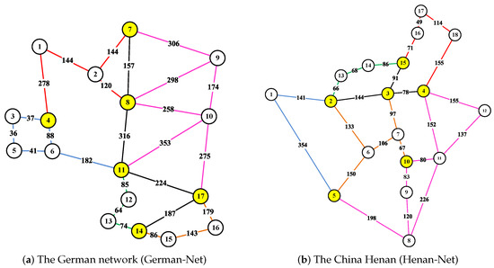 Figure 5a shows the German network (German-Net) with 17 nodes and 25 links, while Figure 5b depicts the Henan network (Henan-Net) in China with 18 nodes and 25 links. In these figures, the yellow nodes represent filterable nodes and the white nodes represent non-filterable nodes. Links of the same color belong to the same tree (excluding the black links), and the numbers on the links indicate their lengths in kilometers (km).