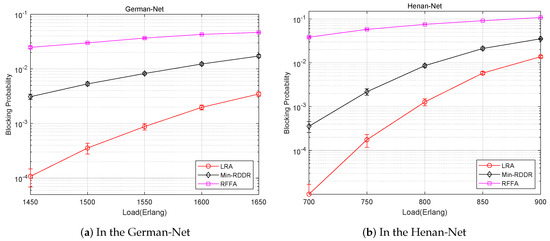 Comparison of blocking probability in (a) German-Net and (b) Henan-Net.