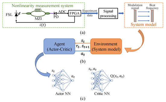 Schematics of (a) nonlinearity measurement system and system model, (b) reinforcement learning, (c) actor-critic structure.