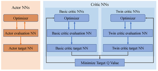 where and represent the parameters of the evaluation NNs and the target NNs, separately, and represents the update rate. The update frequency of the actor target NN is half of the critic target NNs.