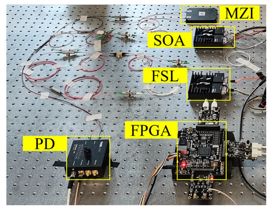 The experimental platform of the nonlinearity measurement system. FSL represents the frequency-swept laser, SOA represents the semiconductor optical amplifier, MZI represents the Mach–Zehnder interferometer, PD represents the photodetector, and FPGA represents the field programmable gate array.