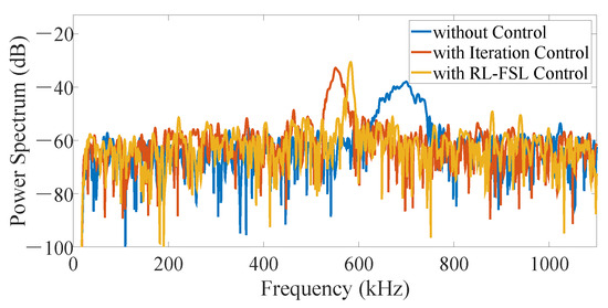 The spectrum analysis of the beat signals with different control methods are shown in Figure 4, Figure 5, Figure 6 and Figure 7. The initial modulation current is a linear sawtooth signal. Since the nonlinearity of the FSL, the frequency of the beat signal is time-variant as the short-time fast Fourier transformation (STFFT) result shown in Figure 4. Meanwhile, with the control policies, the corresponding beat frequency (Figure 5 and Figure 6) is much closer to a constant, especially in our case. According to Equation (2), it means a much smaller RMSRN verifying the effectiveness of our RL-FSL. With the power spectrum analysis shown in Figure 7, it is obvious that, compared to the case without control, the frequency components contained in the beat signals are reduced and the proposed RL-FSL is better than the iteration method. The bandwidth of the beat signal with the control of our RL-FSL method is 5.6 kHz, which is an order of magnitude improvement compared to 59.2 kHz without linearization. And, the bandwidth based on the iteration method is 19.8 kHz. Considering the Equation (10), we can approximate the corresponding RMSRN as 57.3 MHz, 910.3 MHz, and 283.3 MHz, respectively, which represents a significant improvement of the linearity by using our data-driven method. Since the aim of the RL-FSL is to learn long-term reward-maximum behavior, with the proper design of state, action, and reward, the linearization task is converted to the MDP and achieves the control policy suitable to the whole sweep period, where the nonlinearity is extremely variable with time. However, the performance of the iteration method is not good enough in this broadband frequency-swept linearization task. Because of the inherent randomness of the system and the little concern of the influence among different time steps, it is quite difficult to obtain a stable control policy with the iteration method, which would affect the performance of linearization accordingly. Since the principle of the nonlinearity measurement system is similar to the FMCW LiDAR system, we use the beat signal collected in the nonlinearity measurement system as the distance detection result to evaluate the effect of linearization on ranging precision. Based on Equation (11), the best achievable resolution of our method is 0.0072 ml much better than the results without linearization (0.0759 m) and with the iteration method (0.0254 m). Therefore, our proposed RL-FSL would be powerful in the FMCW LiDAR and other application systems.