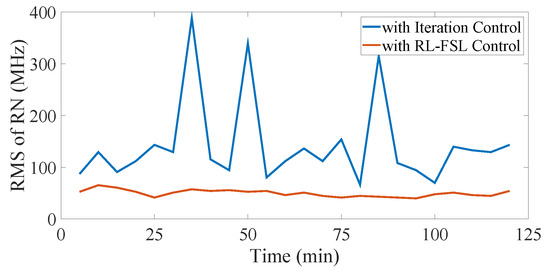To achieve a stable resolution, it is necessary to monitor the long-term performance of the control methods. As shown in Figure 8, the experimental system operates continuously for over 2 h and the modulation current is updated every 5 min. It is evident that the RMSRN of the beat frequency is larger and highly volatile with the iteration control. It turns out that the iteration process does not make the method robust to the noise of the system, or even worse. On the contrary, the curve of the RMSRN shows small fluctuations over time without degradation, indicating a stable work condition and control efficiency of the RL-FSL methods. Therefore, the established simulator performs good descriptions of the system characteristics and the off-line well-trained control policy performs well in long-term operation, demonstrating the potential of generating the linear frequency-swept signal in the application systems of the FSL without the aid of extra components like the iteration method.