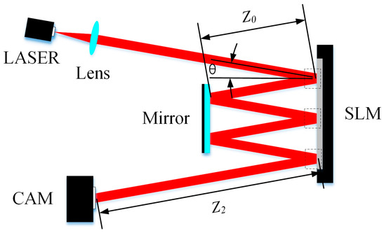 Schematic of adjustable multi-pass cavity beam transmission Lens: Collimating lens; SLM: Spatial Light Modulator; CAM: Camera; Z0: Transmission distance between the center of the phase mask on SLM and the mirror; θ: Incidence angle of the incident beam; Z2: Beam output transmission distance.