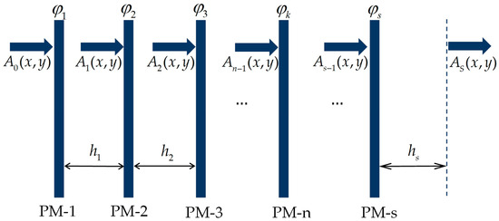 where is the total number of the phase masks loaded on the SLM, is the light field distribution before the ith phase mask, is the phase modulation by the ith phase mask, is the impulse response of the ith spatial transmission shown in Equation (2).