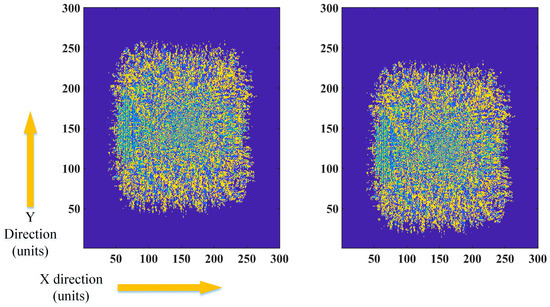 The intensity is defined as the energy of each unit, and the intensity of the output beam can be calculated as . The beam intensity distribution is 1400 units × 1400 units. According to the position of the output beam in the receiving plane, the intercepted image of 400 units × 400 units is shown in Figure 8, and divided into four 200 units × 200 units parts numbered 1–4.