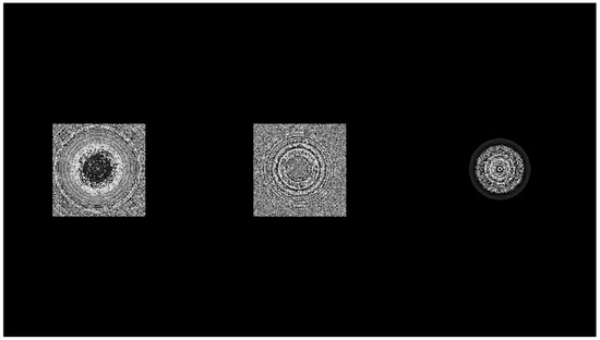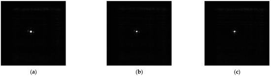 In order to position the second and third phase masks accurately, we utilized the Fresnel lens in combination with relevant calculations. Specifically, each of the three-phase masks was loaded into its respective Fresnel lens, ensuring correct alignment. All images are presented in Figure 18. The centroid coordinates of the three spots are (830,898), (829,898), and (828,898). The centroid distances between the three spots are only two pixels of the camera, which is equivalent to 0.41 units of SLM. It means that this step shifts the three-phase masks to the optimal position by less than one unit.