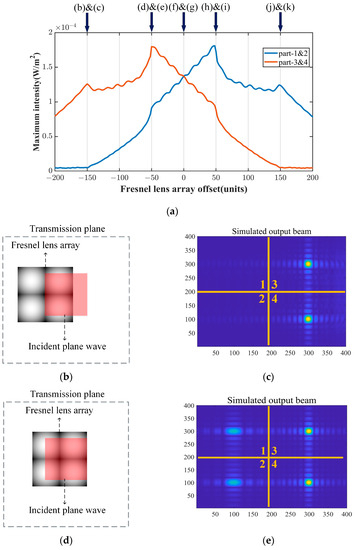 When the offset of the Fresnel lens array is over 150 units in the negative direction of the X-axis and part of the right half of the Fresnel lens array intersects with the incident plane wave and undergoes modulation, the maximum intensity of parts 3 and 4 is proportional to the intersection size. Between 150 units and 50 units in the negative direction of the X-axis, the right half of the Fresnel lens array completely intersects with the incident plane wave, resulting in the maximum intensity of parts 3 and 4 in the output beam remaining at its peak value. When the offset ranges from 50 units in the negative direction of the X-axis to 150 units in the positive direction of the X-axis, the part of the intersection where the right half of the Fresnel lens array intersects with the incident plane wave drops off, resulting in a gradual decrease in the maximum intensity for parts 3 and 4 of the output beam. In a similar way, the intersection part, where the left half of the Fresnel lens array intersects with the incident plane wave, and the maximum intensity for parts 1 and 2 have a symmetry change with the right half, and parts 3 and 4 have a zero offset. These are shown in Figure 9.