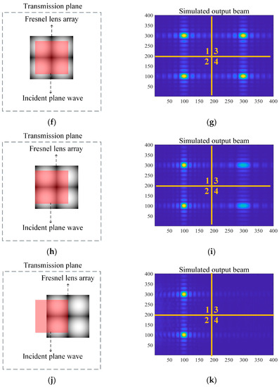 (a) The schematic diagram shows the corresponding offset of the Fresnel lens array in picture (b−k); (b−e): The schematic diagram and the simulated output beam distribution when the Fresnel lens array offsets 150 units and 50 units in the negative direction of the X−axis (f,g): The schematic diagram and the simulated output beam distribution when the center of the Fresnel lens array and incident plane wave have no shift (h−k): The schematic diagram and the simulated output beam distribution when the Fresnel lens array offsets 50 units and 150 units in the positive direction of the X−axis.