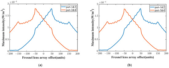 The relationship between the maximum intensity of the four parts of the output light and the offset of the loaded Fresnel lens array. (a) The offset is ±200 units in the Y direction; (b) the offset is ±200 units in the X direction.