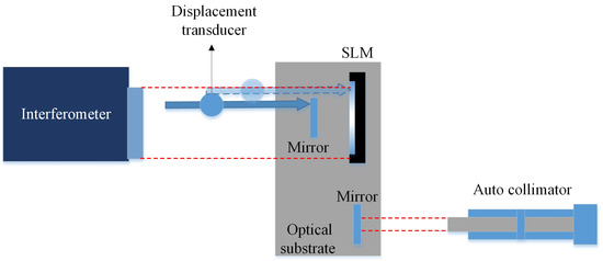 Firstly, an interferometer is used to detect fringes to ensure parallel alignment between the mirror and SLM within the multi-pass cavity. Simultaneously, the distance between the mirror and SLM is determined using a displacement transducer. The moving angle of the optical substrate is determined using an autocollimator. This process ensures that the incident beam is directed at a specified angle, facilitating precise alignment. The schematic diagram of the first step is shown in Figure 12.