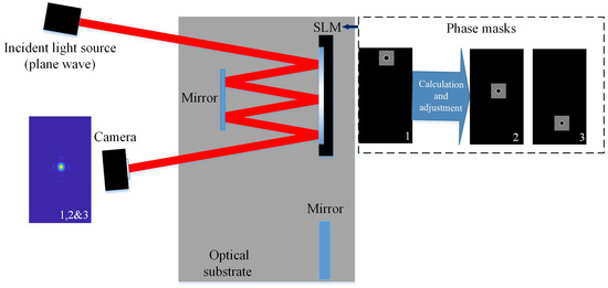 Thirdly, a focal length corresponding Fresnel lens is introduced at the location of the first phase mask, causing the incident plane waves to converge on the camera as they pass through the Fresnel lens. The position of the resulting spot is recorded. Subsequently, the focal lengths of the Fresnel lenses of the second and third phase masks are generated and adjusted. The transverse and longitudinal positions of the output light spot are modified to achieve the recorded position, and the loading positions of the second and third phase masks are recorded at this stage. The schematic diagram of the third step is shown in Figure 14.