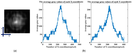 The received cropped image and its distribution. (a) The cropped Gaussian beam image and the marks of X and Y directions. (b) The average gray value distribution of each X-coordinate and Y-coordinate.