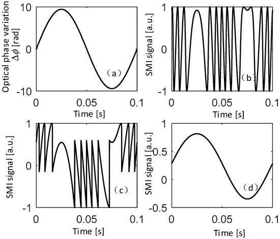In SMI sensing schemes, optical feedback coefficient C affects the waveform of an SMI signal and the stability of an SMI system [31,32]. Figure 2 shows the simulated SMI signals with different optical feedback coefficients. It can be seen that the SMI signal is in a linear relationship with the optical phase variation when C is properly set, as shown in Figure 2d, where the SMI signal replicates the shape of the optical phase variation . In this study, we use the state of Figure 2d to demodulate the AE signal as the SMI is directly proportional to the AE signal in this case without requiring further signal processing. For the details of controlling the SMI system operating in this state, researchers can refer to our previous work [12]. When the SMI system operates in this state, the variation part of the laser intensity or SMI signal can be expressed as: