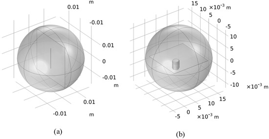 In order to analyze the optical phase variation sensitivity induced by AE signals, we designed a finite element analysis model, as shown in Figure 3. We simulated the strain information on the common straight fiber and coiled fiber wound on the skeleton induced by the same AE source. Figure 3a is for a piece of common straight fiber and Figure 3b is for the coiled fiber wound on a skeleton. In Figure 3b, the skeleton is an acrylic cylinder that is glued to an aluminum plate. A sound source is set on the aluminum plate about 2.0 cm away from both the straight fiber and coiled fiber. When sound waves reach the interface between the AE sensor skeleton and the aluminum plate, waveform conversion, reflection and refraction occur. A portion of the waves goes into the skeleton and the other part stays on the aluminum plate. AE waves entering the skeleton undergo waveform transformation, reflection, and repeated refraction.