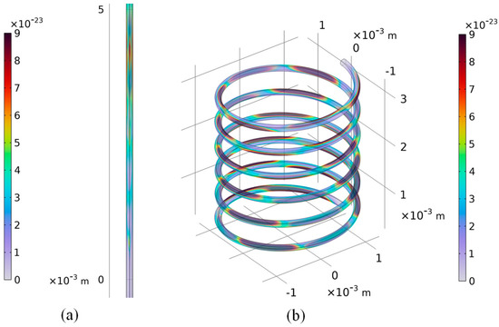 Figure 4 shows the comparison of the strain results produced in the straight fiber optic and fiber ring under the excitation of the same sound source at 150 kHz. The simulation results show that the induced strain of the coiled fiber is much stronger than that of the ordinary straight fiber, indicating that the sensitivity of the coiled fiber ring to the AE source is much higher than the of the ordinary straight fiber.