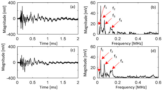 The detected experimental AE signal, (a,c) are the AE signals detected by the SMI coiled optical fiber sensor and commercial AE sensor, respectively; (b,d) are the corresponding magnitude spectra of (a,c), respectively.