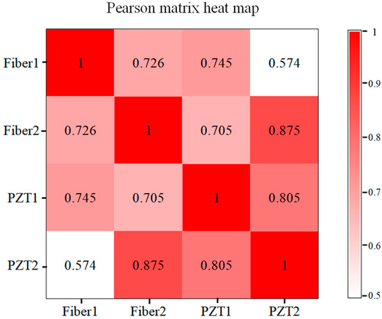 In order to further verify the feasibility and stability of the proposed coiled optical fiber sensor, Pearson correlation analysis, which is a statistical data test designed to reflect the degree of similarity between two variables, has been performed on the experimental signals. The Pearson correlation coefficients between the four groups of empirical data in Figure 6 and Figure 7 have been calculated and are shown in Figure 8, where Fiber1 and Fiber2 correspond to the spectra results for the proposed fiber sensor from the one-ball dropping and two-ball dropping, and PZT1 and PZT2 are for the commercial piezoelectric AE sensor. All the data passed the significance test. The Pearson correlation coefficients between the data from the SMI coiled fiber sensor and commercial AE sensor are 0.745 and 0.875, respectively, for one-ball and two-ball dropping, demonstrating that the proposed fiber sensor has comparable AE detection capability to the commercial piezoelectric sensor. Conversely, the Pearson correlation coefficients between the data from one-ball and two-ball dropping are 0.725 and 0.805, respectively, for each sensor, which demonstrates the strong correlation between the AE signals from one-ball and two-ball dropping. It might be explained by the notion that the detected AE signals for two-ball dropping are the superposition of two AE signals of one-ball dropping, being similar to the interference of two sound waves. Hence, another experiment was carried out to demonstrate this point.
