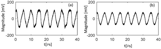 Figure 6 shows the experiment results, where Figure 6a is the AE signal detected by the proposed SMI coiled fiber sensor, and Figure 6c is the signal detected by the commercial AE sensor. Figure 6b,d are, respectively, the corresponding Fourier magnitude spectra. These two sensors simultaneously detected the AE signals caused by the metal ball falling impact during the time around 0–1 ms. The peak frequency of the AE event is near 32 kHz in the spectrum diagram. From the comparison in Figure 6, it can be concluded that the detection results of the SMI coiled fiber sensor are highly similar to those of the commercial sensor. The slight differences in the detected results may be caused by the hysteresis of the piezoelectric sensor, as well as by the different linearities, noise floors and pre-amplification gains of the two sensor systems. It is noteworthy that the commercial AE sensor has a displacement sensitivity of near 35 kHz, while the SMI coiled fiber sensor has been tested with a sensitivity of . So, the AE-induced displacement to the commercial AE sensor is about 13 nm, while the induced displacement of the coiled sensing fiber is about 1 . This is larger than the value of the AE sensor thanks to the multi-coil structure. Nevertheless, it can be seen from the above experiments that the measurement results of the proposed SMI fiber ring sensor have almost the same shape and equivalent output voltage amplitude to those of the piezoelectric acoustic emission sensor. This demonstrates that AE detection of the designed SMI coiled fiber sensor is feasible, showing comparable AE detection capability to piezoelectric sensors and providing a new cost-effective solution for AE detection. Also, it should be noted that the effect of the environmental temperatures on the fiber was not considered at that point.