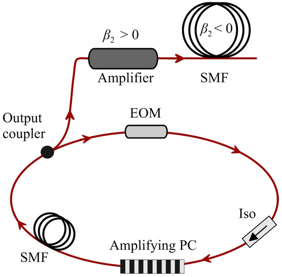 The key element of the model is the ring oscillator consisting of a photonic bandgap amplifier or an amplifying PC [22,23], an electro-optic modulator (EOM), a segment of the SMF, an isolator providing unidirectional signal propagation in the cavity and an output coupler (Figure 1).