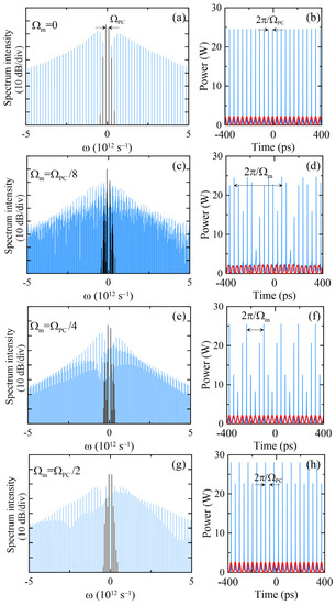 Figure 6 shows some features of this process for different modulation frequencies, . Initial conditions without a phase modulator (Figure 3a,b) correspond to the standard modulation instability case when the amplitude-modulated signal is transformed into the train of short pulses, with a repetition rate equal to the amplitude modulation frequency, (Figure 6a,b). The ring oscillator configuration with the phase modulator possesses two basic frequencies, and , determined by the bandgap amplifier and phase modulator, respectively. The width of the whole frequency comb is approximately equal for all the values of (~1013 s−1 on −30 dB level, which corresponds to about 12.5 nm in the telecommunication range) and is inversely proportional to the output single-pulse duration. (From Figure 5a, one can see that ps and this value does not actually depend on the modulation frequency .) As noted above, the comb spacing parameter is equal to , but near the top of the spectral comb, additional modulation with the frequency can be observed (Figure 6c,e,g).