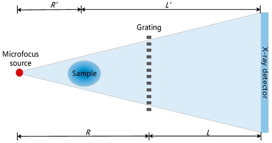 In our experiments, we used a microfocus X-ray source (HAMAMATSU PHOTONICS, L9421-02) with a nominal focal spot of 7 µm, and set the voltage to 40 kV and the tube current to 100 µA to obtain each image with an exposure time of 10 s. An X-ray flat panel detector (PerkinElmer, Waltham, MA, USA, Dexela 2923NDT) with a pixel size of 74.8 µm × 74.8 µm and a total active area of 29 cm × 23 cm was used to record all images. We set two imaging distances, R and L (Figure 2), to be 393 mm and 1007 mm, respectively, resulting in a magnification of M = (R + L)/R = 3.56. The Hybrid Hexapod (PI H-824) was used to adjust the grating position. We aligned one fringe period with the size of two detector pixels.
