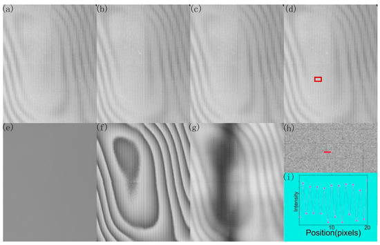Measurement of background signals. (a–d) are the intensity distributions with gratings at different positions, and the relative positions are 0, T/4, 2T/4, 3T/4, respectively. (e–g) are the distribution of , and . (h) is the enlarged image marked by the red rectangle in (d). (i): the profile marked by the red line in (h) shows that the period of the projection fringes is the size of two pixels. Each exposure time is 10 s.