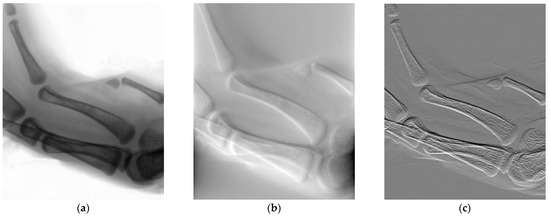 The obtained attenuation and phase-contrast images of chicken feet. (a) is the attenuation image. (b,c) are the phase-contrast images retrieved using Fourier transform and our proposed methods, respectively. The imaging area of each image is 29 cm × 23 cm.