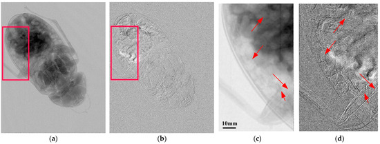 We tested two samples, chicken feet and an insect with a complex structure under the same conditions as in Figure 3. Both samples were placed near and in front of the grating. Using the data measured in Section 3.2 and Equation (7), attenuation and differential phase-contrast information were extracted from the radiography images of the single-shot samples, as shown in Figure 4. The figure includes the obtained multimodal images of the chicken feet: the attenuation and phase-contrast images. Figure 4b,c are both phase-contrast images retrieved using the Fourier transform algorithm [25] and our proposed method, respectively. Since the Fourier transform algorithm requires the use of a window function, some information loss is inevitable. Therefore, Figure 4b appears smooth and blurred, while Figure 4c shows more details. The more complex insect was also used to demonstrate the advantages of phase-contrast images over attenuation images, as shown in Figure 5. Figure 5a,b are the obtained full attenuation and phase-contrast images, respectively; Figure 5c,d are zoomed-in images corresponding to the regions marked by red rectangles in Figure 5a,b. Obviously, the phase-contrast image in Figure 5d shows more structure than the conventional attenuation image in Figure 5c. Especially for the parts with the red arrows, those tissues are clearly visible in Figure 5d but not in Figure 5c.