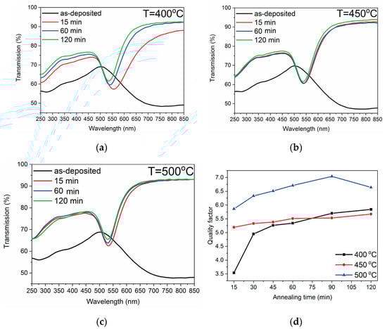 Transmission spectra of gold thin films heat-treated at (a) 400 °C, (b) 450 °C, and (c) 500 °C for different times. (d) Dependence of the LSPR quality factor on heat treatment time at different temperatures.
