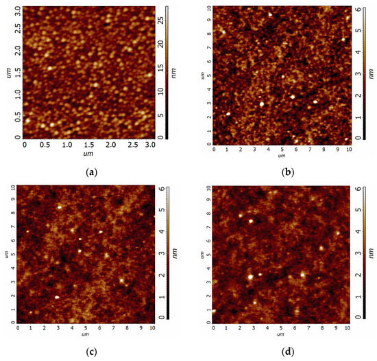 To study the topology of the samples surfaces, they were characterized with AFM. Figure 4a displays a typical surface profile observed after dewetting of the gold film at 500 °C for 90 min. The surface contains closely packed, self-assembled gold nanoparticles with a height below 25 nm. Very smooth surfaces with RMS roughness below 1 nm were observed after Nafion deposition (Figure 4b–d).