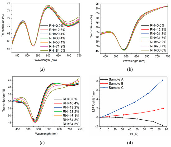 Another typical method to detect humidity levels is the measurement of transmitted power in some spectral range [67,68]. To identify the spectral range with the most significant changes, differential spectra obtained from transmission spectra at variable RH by subtracting the spectrum of the corresponding sample in dry nitrogen were calculated (Figure 6a–c). In the case of Sample A, characterized by the lowest shift of the LSPR band with humidity, the largest response was observed in the red part of the visible spectrum, reaching an increment of transmission around 1.4% with a growth RH from 0% up to 84.5%. However, the transmission changes were mostly caused by the shift of interference fringes, with additional contributions from the LSPR band in the range between 525 nm and 625 nm. Samples B and C possessed maximal changes in transmission, around 3.5% and 7%, respectively, in the spectral range 550–600 nm associated with the long-wavelength shift of the LSPR band.