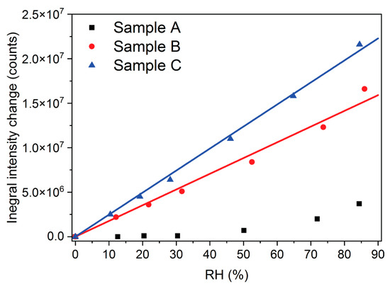 Figure 6d shows the temporal dependence of the change in integral intensity registered in the spectral range 550–600 nm (in the case of a sensor prototype, this value would be proportional to the optical power registered with a conventional photodetector). Due to minor changes in the transmission of Sample A, the response was undetectable in the range of RH below 30%. Moreover, the sample did not show a reversible response since the signal at dry nitrogen after being subjected to a wet atmosphere significantly differed from the initial one. On the other hand, the samples covered with thicker Nafion films possessed a linear response in all the studied RH ranges from 0% to 85%, with linearities of 98.3% and 99.7% (Figure 7). The limit of detection for sensors is typically calculated as 3σ/S, where σ is the standard deviation calculated in our case at dry nitrogen over 5 min, and S stands for sensitivity, defined as the slope of the response curve. The limits of detection of the samples were found to be 1.8% and 1.1% for samples B and C, respectively. The amplitude of the response for a change in RH from 0% to 85% was about 20% greater for Sample C compared to Sample B.