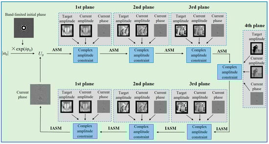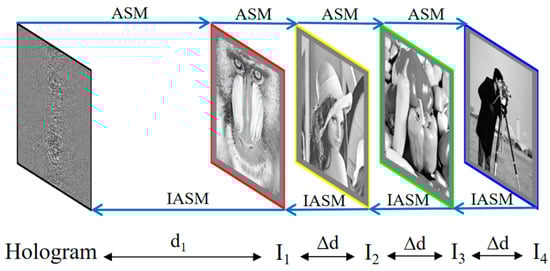 The sequential optimization method, which combines the ASM, is capable of calculating holograms with multiple planes comprising different distances. However, due to the in-depth order of hologram propagation, the accuracy of reconstructing an object layer situated farther away can be negatively impacted by the reconstruction error of an object layer closer to the hologram, leading to a decrease in the overall reconstructed image quality. As a result, the sequential optimization method exhibits superior reconstruction accuracy for the object layer closest to the hologram plane, while the accuracy of far layer planar reconstruction is relatively low. The algorithmic flowchart is presented in Figure 2, where IASM denotes the inverse angular spectrum method, and z represents the plane spacing.